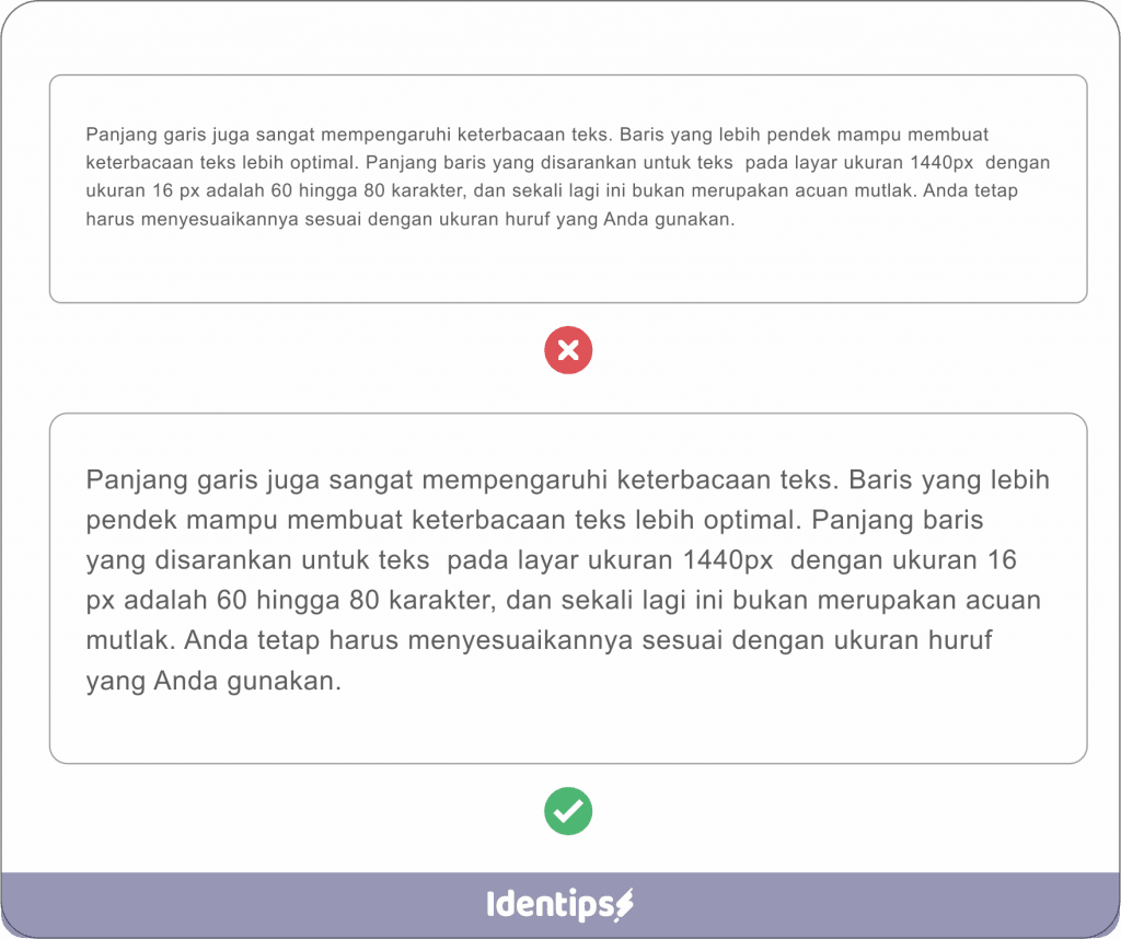 Panjang garis juga sangat mempengaruhi keterbacaan teks. Baris yang lebih pendek mampu membuat keterbacaan teks lebih optimal. Panjang baris yang disarankan untuk teks pada layar ukuran 1440px dengan ukuran 16 px adalah 60 hingga 80 karakter, dan sekali lagi ini bukan merupakan acuan mutlak. Anda tetap harus menyesuaikannya sesuai dengan ukuran huruf yang Anda gunakan.