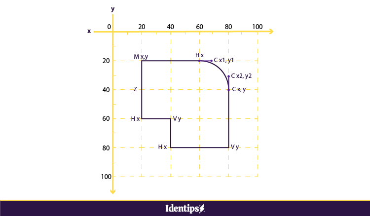 - M (moveto) digunakan untuk menentukan titik awal dari sebuah path. Sintaks M x,y