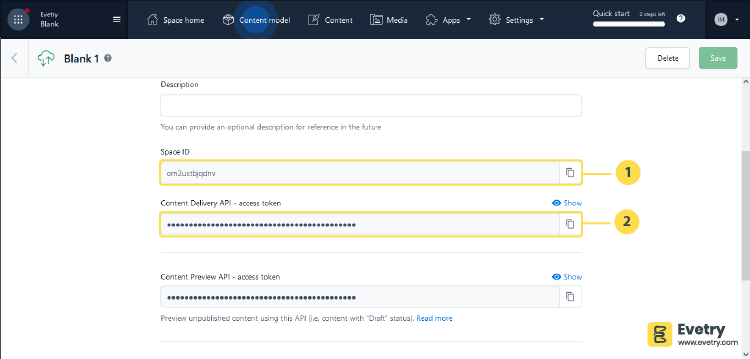 Kemudian salin Space ID (1) dan Content Delivery API - access token (2).