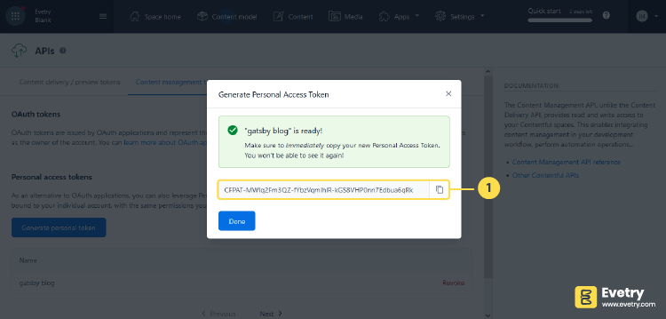 Kemudian klik Generate personal token, masukkan nama token (mis: blog gatsby) kemudian klik Generate lalu salin Content management tokens (1) tersebut.